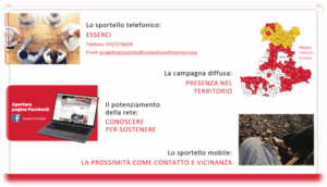 Le attività del progetto hanno avuto come denominatore comune l’obiettivo di rappresentare una risorsa conoscitiva e di supporto per tutte le persone che a qualsiasi titolo, hanno avuto l’accesso agli sportelli telefonici, itineranti e fissi che sono stati messi a disposizione nel territorio di Padova, dell’Alta e della Bassa Padovana.