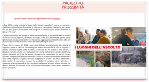 A fine 2022 è stata istituita la figura dello “street counsellor”, ovvero un operatore qualificato dal profilo professionale di educatore, con grande esperienza sul campo, che ha dato piena disponibilità nell’accogliere la necessità per alcuni chiamanti di operare “in vivo”.